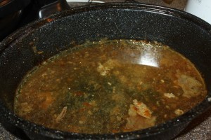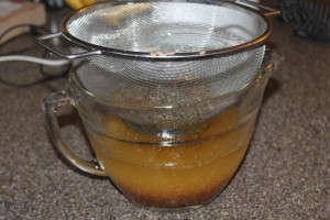Then pour the entire contents of the pan drippings in the strainer. Discard what is in the strainer and use the remaining liquid for the gravy.