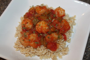 A Louisiana inspired dish of cooked shrimp in a mixture of whole or diced tomatoes, the “holy trinity” of onion, celery and bell pepper, spiced with hot pepper sauce and/or cayenne-based seasoning, and served over steamed or boiled white rice.
