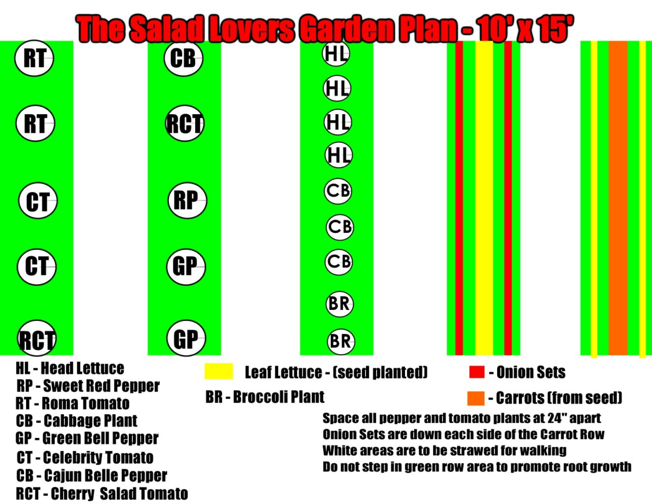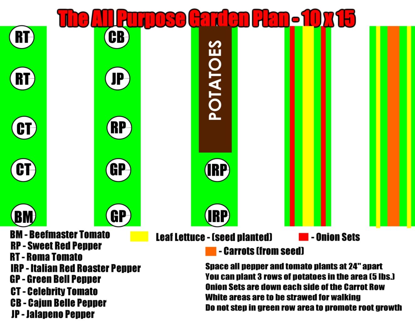 So you have your raised row beds all built – and your ready to plant! The sky really is the limit for what you want to grow. The real key is in how you plant and maintain your crops. At the bottom of this post, to help with some ideas, we have included 3 simple garden plans for a salsa, pasta sauce, and all-purpose garden. Once your garden is planted – you will be amazed at how little you need to work in it each day to keep it looking great. If you simply spend 5 to 10 minutes a day in the garden – walking the rows and pulling a few weeds here and there in the planting rows – it will stay amazingly clean with little effort. Your reward will be great tasting vegetables for you and your family. But for now – here are the real keys for success in planting and maintaining your raised row garden beds: