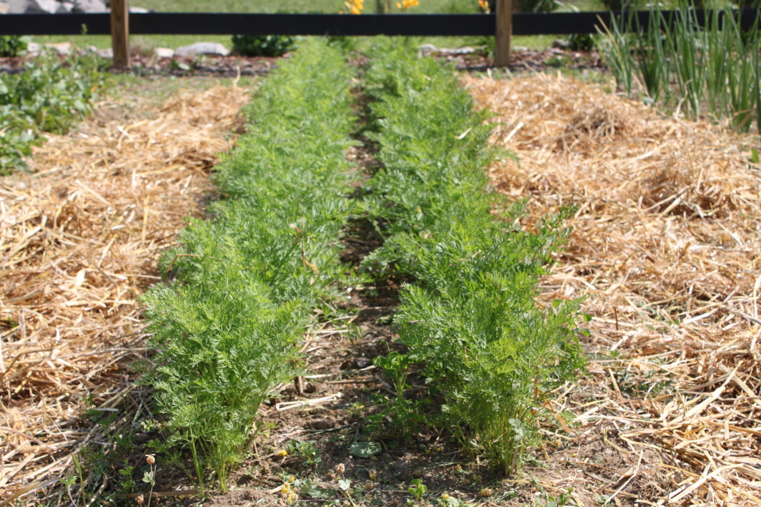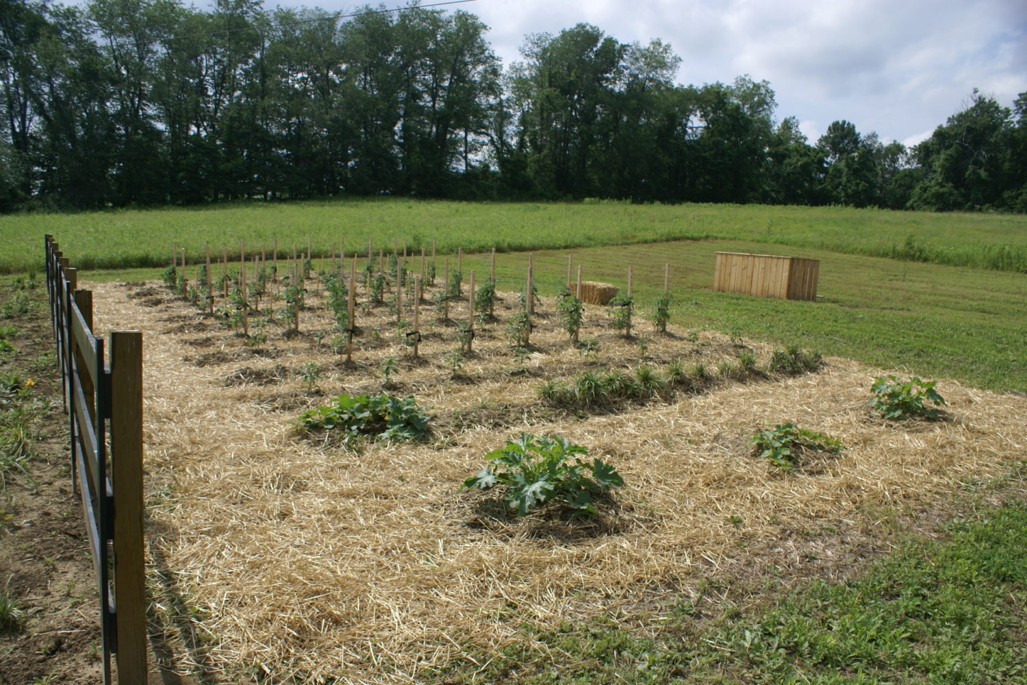 For planting seed portions of the bed – such as lettuce, carrots, peas, etc. – plant right into the topsoil that is above the straw. Just use your finger or a hoe to make a small depression in the topsoil and spread the seeds according to the package, and cover. I do not mulch my seed crops, allowing for them to germinate and come up through the soil. Once our peas and green beans come up – I will then put down a 1/2″ layer of mulch around the plants.