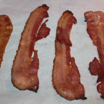 6. Remove from oven and place each piece of bacon onto parchment paper or a plate to cool. Do not place the bacon on paper towels as they will stick.