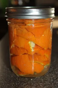 - Peel several oranges and place as flat as you can in a pint mason jar. **You can also save your orange peels in the freezer until you are ready to fill a pint jar.