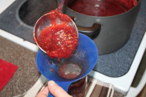 8. Ladle jam into hot half pint jars, wipe off the rim, place warm lid on the jar and secure with the ring.