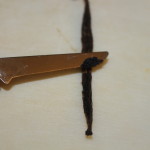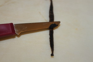 2. Split a vanilla bean in half, and with the your knife, scrape the inside of the bean and place into pot with the strawberries.