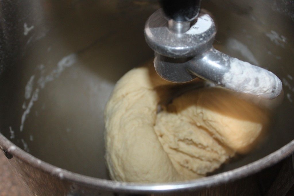 4. Attach the dough hook to the mixer and turn to medium-low speed. Gradually add the remaining flour, kneading until a ball begins to form and scraps away from the bowl.