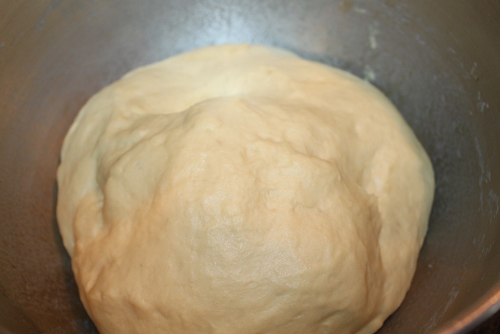 While you are waiting for the dough to rise, grease a 9 x 13 baking pan and set it aside. Then when the dough has doubled in size, remove the dough to a clean surface.