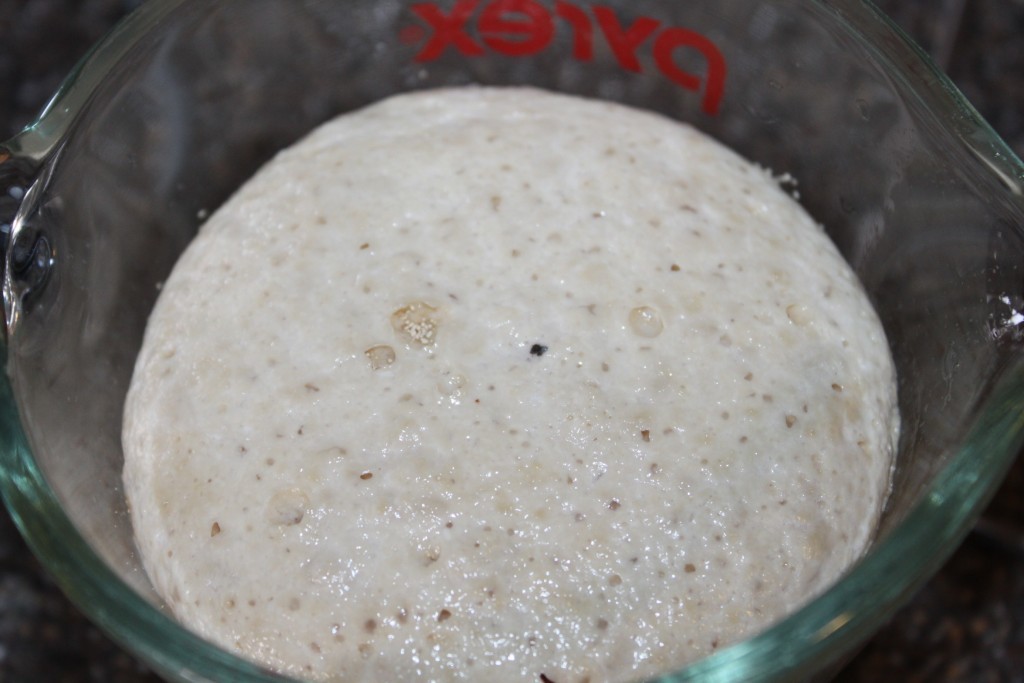 Once the liquid is between 105°F – 110°F add in a packet of active dry yeast. Let the yeast sit in the warm liquid and activate for 10 minutes. At that time the mixture should be foamy and bubbly.
