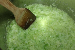 Now place a large stockpot over medium heat and add the olive oil. Once hot add the onion, garlic, green pepper mixture and cook until the onion becomes transparent.