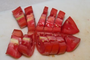 The first step in making this freezer spaghetti sauce is to prepare the vegetables. First, chop the tomatoes into 1 inch chunks.