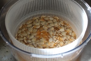 Then place the drained seeds into a lettuce spinner, and with just a few whirls, the seeds are almost entirely clean.