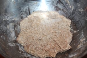 After the initial rise, the dough should be doubled in size. Now sprinkle some flour on top of the dough and generoulsy flour your hands.
