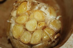 The garlic should be light golden brown in color. Let the bulb cool until it can safely be handled and then remove the roasted garlic cloves with the handle of a standard eating utensil. Let them cool completely.