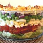 Seven Layer Salad is a classic picnic and get-together recipe served in many parts of the United States, especially the Mid-West.