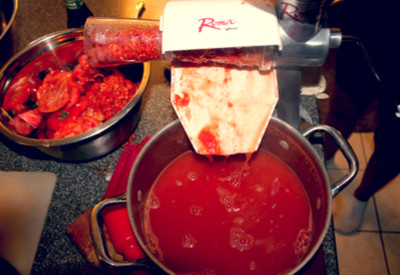 7. Then pour the tomatoes through a food mill to remove the seeds and skins. We use a Roma Food Strainer and Sauce Maker. The time it saves us from not having to peel and de-seed the tomatoes is well worth the purchase! Plus we use it to make salsa and applesauce as well!