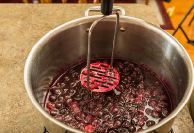 Next, add the crushed grapes to a large non-reactive stockpot. Repeat the process until all of the grapes have been crushed and then transferred to the stockpot.
