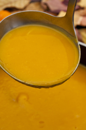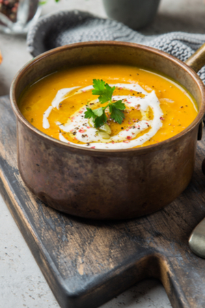 A heart warming soup with roasted butternut squash and flavored with maple syrup, nutmeg, and cinnamon.