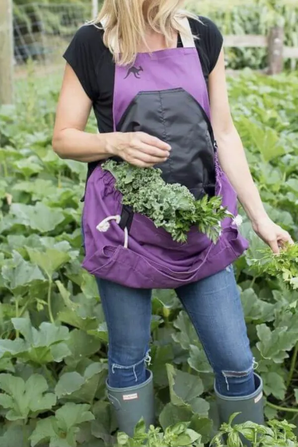 Well, the Roo Apron is absolutely perfect for solving that issue and more. It not only has a place for storing anything you harvest as you go, but it keeps you clean in the process. Even better, you can haul tools and more in the handy pockets as well.