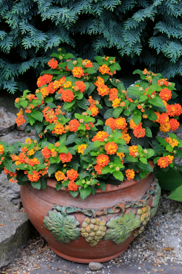 If you want flowers that bloom heavily in the heat and still keep deer away, lantana is a top choice. This tough annual produces small, clustered blooms in tropical colors of orange, red, pink, yellow, and purple. The flowers are loved by butterflies, bees, and hummingbirds – but not by deer.
