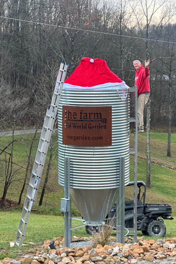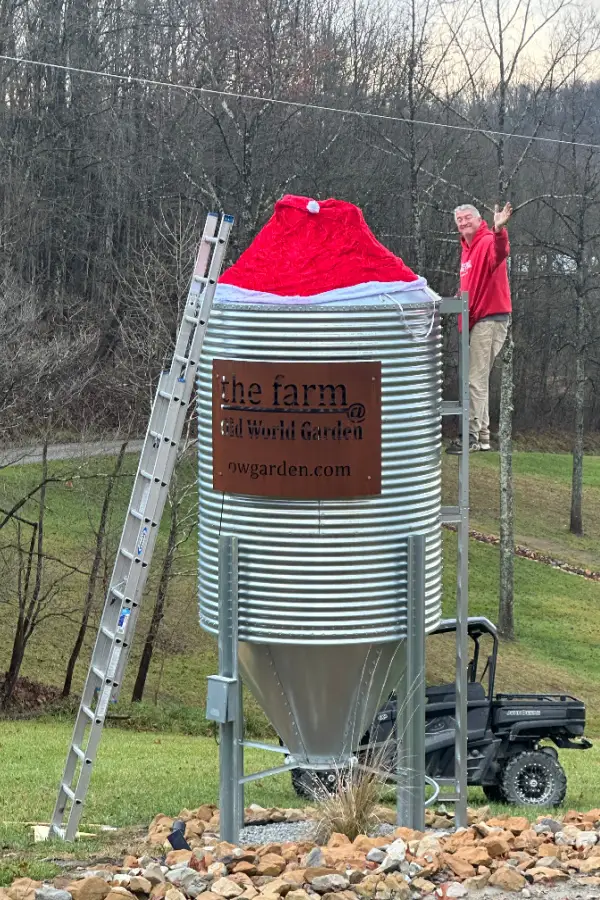 Seeing that massive red hat sitting proudly on top of the grain bin instantly became one of our favorite moments of the season. It looks cheerful, whimsical, and downright fun. It’s the kind of decoration that makes people smile the moment they see it.